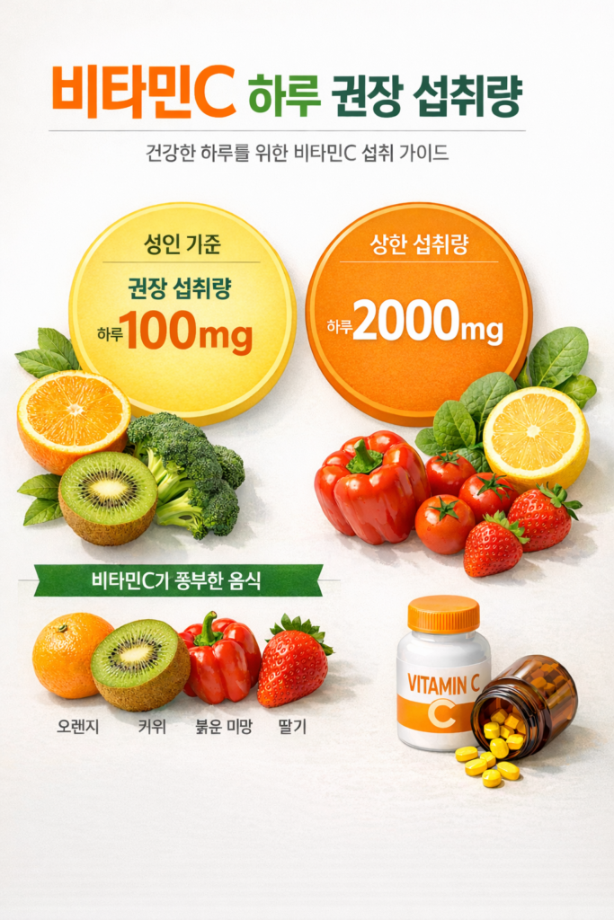 성인 기준 비타민C의 1일 권장 섭취량은 약 100mg이며, 상한 섭취량은 2,000mg으로 제시됩니다.